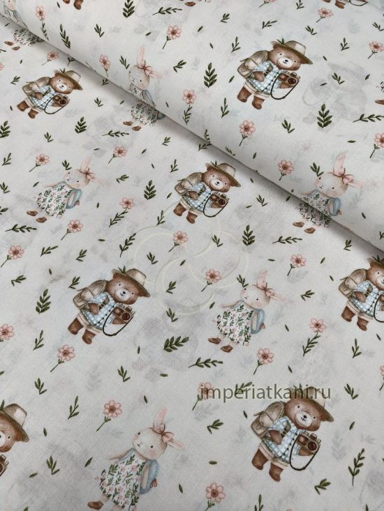 Детская перкаль «Прогулка» шириной 150 см с изображением на ткани — мишка, поляна с цветами; цветовая гамма: зеленая, коричневая. Опт от 30 000 руб., продажа рулонами.